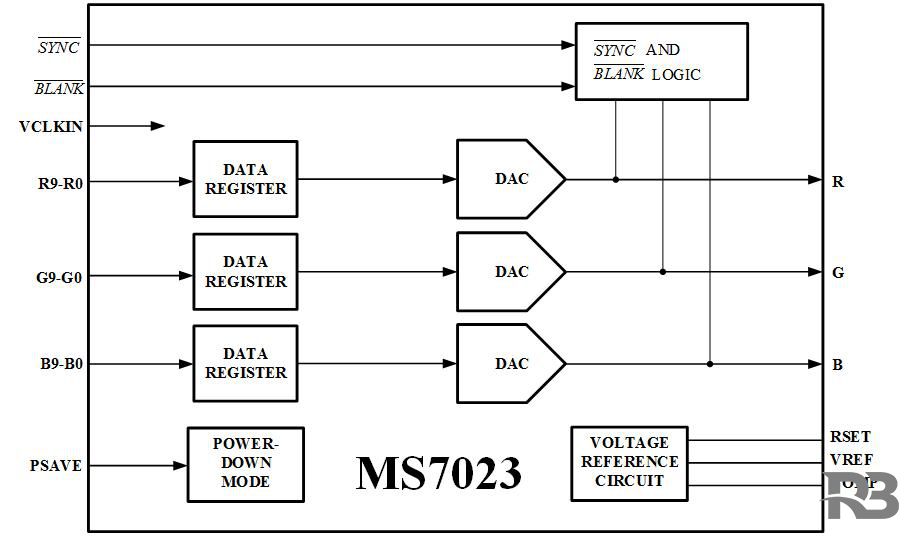 MS7023是一个三路高速、单芯片数模转换器。它包括三路高速、10位输入的视频DA转换器、标准的TTL输入和高阻抗模拟输出电流源。MS7023支持低功耗模式,支持复合SYNC 和EBLANK 功能。